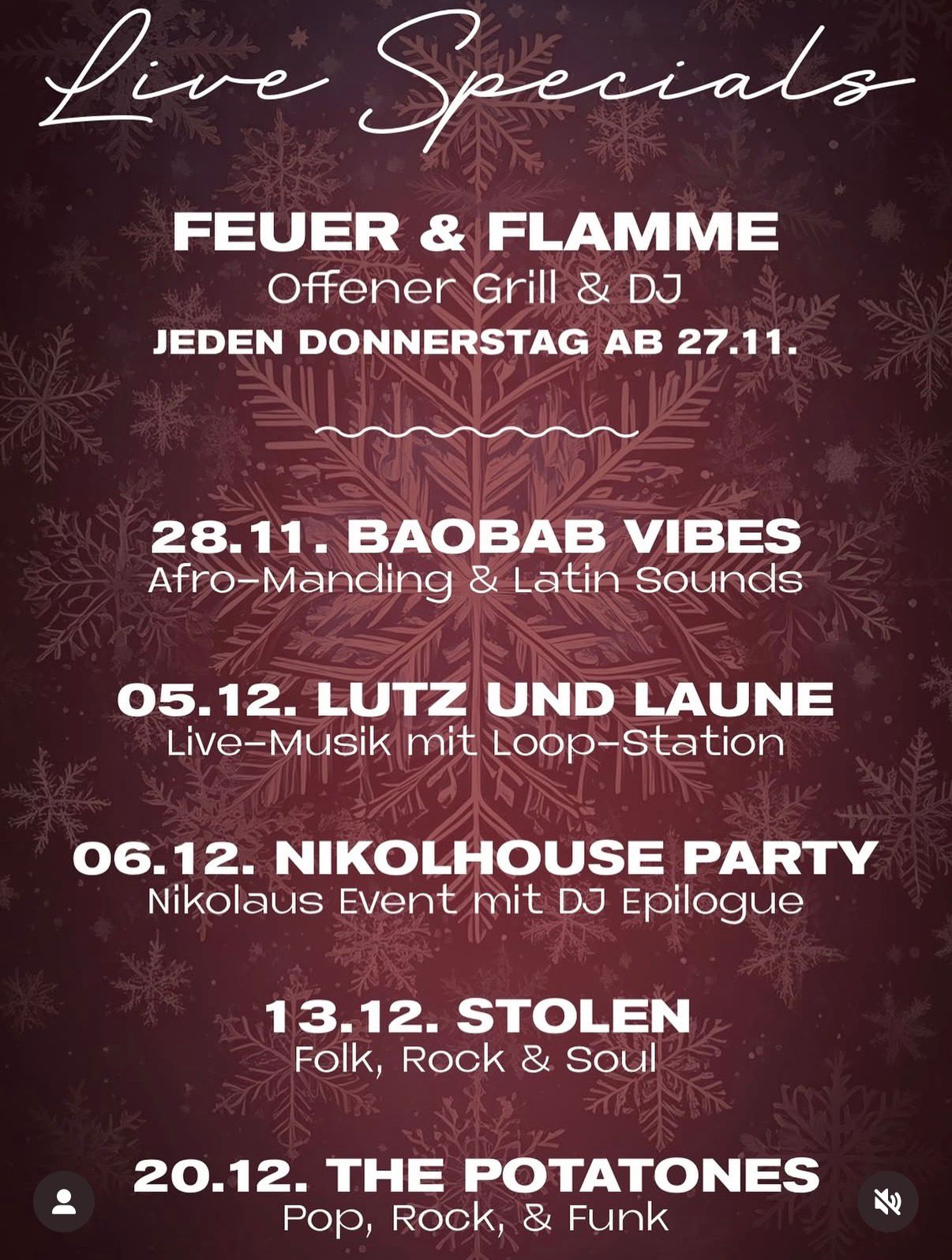 Feinste handgemachte Folk, Rock und Soul songs teils gecovert und teils aus eigener Feder werden in der winterlichen Kulisse der Seebar präsentiert. Die urige Zeltatmosphäre, Feuerkörbe und Lichterketten in den Bäumen sorgen für romantische Stimmung, während die Band dafür sorgt, dass niemand friert, denn spätestens wenn der Sommerhit „Gim-me“ im Reggae Style mitten im Winter ertönt ist mittanzen angesagt.